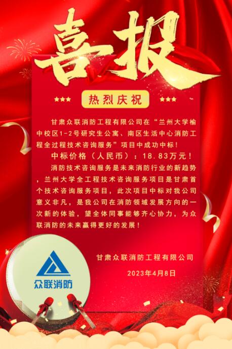 消防技术咨询服务是未来消防行业的新趋势兰州大学全工程技术咨询服务项目是甘肃首个技术咨询服务项目,此次项目中标对我公司意义非凡,是我公司在消防领域发展方向的一次新的体验,望全体同事能够齐心协力,为3499拉斯维加斯官网消防的未来赢得更好的发展!